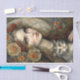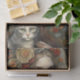 This enchanting portrait marries the Pre-Raphaelite tradition with magical whimsy, featuring a young woman and her feline companion framed by lush vintage botanicals. The composition artfully pairs their matching golden-green eyes and graceful features, while cream and coral flowers create an organic crown effect. Each bloom is rendered with storybook detail, from layered petals to delicate colour transitions.
