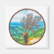 A landscape and elk painting within a circle border frame. This mighty elk has grown trees as antlers. He stands tall watching over his forest of hills and bodies of water.