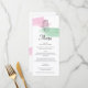 This design features an elegant black outline illustration of a king protea flower. Pink and green watercolor brush strokes bring the black and white floral illustration to life. Pink and green paint strokes create the floral colour tones which compliment the design. The design sits centred separating the sophisticated typography. Elegant wedding menu card design with modern elements. Matching wedding invitations and other stationery items are also available.