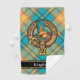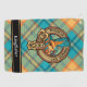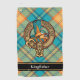 Kingfisher crest badge surrounded by a strap and buckle over tartan background. Custom text.