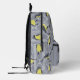 This backpack features my illustrations of a bird that recovered from the brink of extinction, Kirtland's Warbler. The yellow and grey birds are depicted against a light grey and white patterned background.