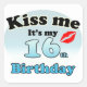 Nice sticker with the text: kiss me it's my 16th birthday. a kiss is shown with red lipstick. And the colors are black and blue. Nice gift to give to someone who's turned sixteen 16, or to show you your birthday