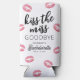 Fun flirty bachelorette can coolers featuring pink lipstick prints with the words "Kiss the Miss Goodbye", the name of the bride, and the date. It's perfect for any bridal party, hen party, or bachelorette weekend away!