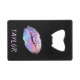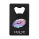 A bottle opener that is fashionable, solid, and sturdy, this item is so chic and pretty. Displaying a pair of kissable neon coloured blue and pink lips, you can write your name underneath in matching font. The background is black. Order yours today!