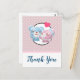 Party thank you postcard with a cute cartoon image of a bear couple, the she bear is pastel pink with a little bow and she is kissing the cheek of a blue bear who looks positively delighted. A little pink heart is floating above their heads. Very cute and kawaii. Background pattern is a muted pink colour with white polka dots. Personalised message on the back.