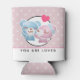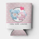 Can cooler which says" You are Loved. Text is editable / removable. Designed with a cute cartoon image of a bear couple, the she bear is pastel pink with a little bow and she is kissing the cheek of a blue bear who looks positively delighted. A little pink heart is floating above their heads. Very cute and kawaii. Background pattern is a muted pink colour with white polka dots.