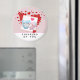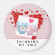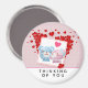 Magnet which says: Thinking of you. Designed with a cute cartoon image of a bear pair, one bear is pastel pink with a little bow and she is kissing the cheek of a blue bear who looks positively delighted. Very cute and kawaii. Lots of red hearts floating all around. Muted Pink background with a white polka dot pattern