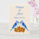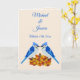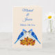 This awesome Wedding Thank You card features a pair of cute Blue Jays. A bird from the crow family with beautiful bright blue feathers and a crest on the head. The beak is black and the belly a shade of blue grey. The birds are facing each other and almost kissing. Between them is a pile of fall Oak leaves and a single acorn, a symbol of their love that also reflects the collecting of acorns undertaken by these birds during fall. A lovely design for celebrating a Wedding, especially during fall or Autumn.