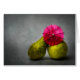 Closeup view of two pears behind the red cocktail umbrella. Water drops all around them. The sky is grey and weather is stormy