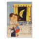 Cute retro artwork showing a husband and wife kissing while doing dishes. The smiling crescent moon in seen in the window.