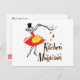 A Custom recipe card on one side with space for your recipe name and lines for writing. The other side has a Kitchen Magician saying with a cute retro chef cooking up a little magic in the kitchen in a sparkly retro font in black, red and yellow. She's wearing a red dress with a yellow apron and her spoon is dripping sparkles onto the saying.