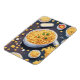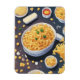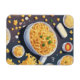 This kitchen magnet features a vibrant and artistic illustration of a mac & cheese-themed feast. The design showcases a large, creamy bowl of cheesy noodles, garnished with fresh herbs, surrounded by smaller bowls of mac & cheese, scattered cheese cubes, butter, and a dipping sauce. The dark background enhances the warm, golden tones of the dish, making it visually appealing and appetising.