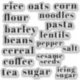 Currently features rice, oats, corn, flour, noodles, pasta, barley, lentils, beans, pepper, salt, cereal, sesame seeds, coffee, tea, sugar, icing sugar.