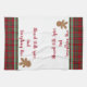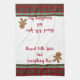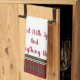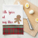 This kitchen towel is shown in red and green plaid with white and green accent stripes. Words of "Blessed with spice and everything nice" shown in red. Shown on a white towel, with Christmas gingerbread men accents.