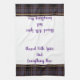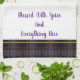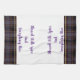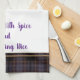 This kitchen towel is shown in darkest purple-wine and smoke plaid with tan accent stripes. Words of "Blessed with spice and everything nice". Shown on a white towel.