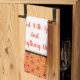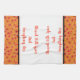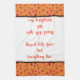 This kitchen towel is shown in fall colour mix of orange, yellows and red leaves at the bottom edges with orange and black accent stripes. Words of "Blessed with spice and everything nice". Shown on a white towel.