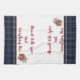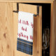 This kitchen towel is shown in sapphire blue and tan plaid with tan accent stripes. Words of "Blessed with spice and everything nice" shown in red. Shown on a white towel, with Christmas gingerbread house accents.