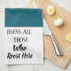 "Bless all those who roost here" is the caption on this Teal Blue and White kitchen towel featuring a White and Red chicken head. Customise this item or buy as shown.
