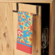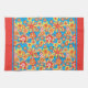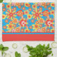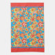 A country-style Kitchen Towel or Tea Towel, with a pattern of red, orange and yellow flowers on a bright turquoise background, from a handpainted paper collage by Judy Adamson, with a red border at each end.