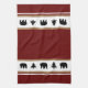 This kitchen towel is shown in a cute lodge style print of bears and fir tree icons in black silhouettes over white stripes and burgundy and tan colour stripes towel with white accent stripes on each end.