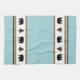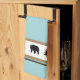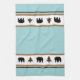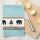 This kitchen towel is shown in a cute lodge style print of bears and fir tree icons in black and chocolate brown silhouettes over white and tan-brown stripes and aqua and chocolate colour accent stripes towel.