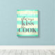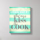 This kitchen wall art is on stretched canvas with cute humourous quote always kiss the cook on distressed blue and grey stripes. Wall art for kitchen decor.