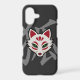 A white and red kitsune fox mask atop the kanji character for "kitsune."
