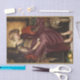 This design features a painting by the British Victorian artist Frederic Leighton (1830–1896). It depicts a boy wearing an elegant purple costume as he plays with a kitten tht is sitting next to him. The boy is holding a pink rose in his hand and he is sitting in an opulent room decorated with great luxury. The setting is ancient Rome. There are some lemons on the floor by the boy's feet. The small cat is looking up towards the boy and it has a blue collar around its neck. The boy and the kitten are sitting on a leopard-print rug. The original artwork was painted by Frederic Leighton sometime between 1880 and 1896.