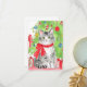 watercolor portrait of a cute kitten sitting under a Christmas tree with a red ribbon bow tied around her neck.