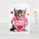This sweet card features an adorable kitten gazing forward with wide, trusting eyes that instantly capture the heart. Its soft tawny stripes and bright white paws stand out against a simple white background. The kitten holds a large pink heart in its tiny paws, decorated with white polka dots and a smaller red heart. Across the heart, the words “Friends fur-ever!” appear in crisp white lettering. Two red hearts float near the top corners, adding extra warmth. Gentle lighting highlights the kitten’s fur and brings a cozy glow to the scene. This card shares a message of friendship, kindness, and affection, making it perfect for Valentine’s Day.
