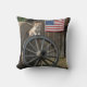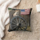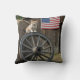 An adorable orange kitten sits atop a wooden wagon wheel. In the background, a hay bale and an American flag are visible against a rustic barn wall
