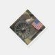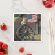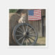An adorable orange kitten sits atop a wooden wagon wheel. In the background, a hay bale and an American flag are visible against a rustic barn wall