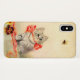 iPhone Case featuring Meta Plückebaum’s artwork Kitten with a Red Ribbon (b. 1876). A grey kitten with dark stripes is beautifully adorned with a red ribbon. The kitten plays with a bee. Yellow flowers decorate the foreground. A wonderful gift for cat lovers and German art enthusiasts!