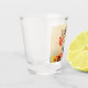 Shot Glass featuring Meta Plückebaum’s artwork Kitten with a Red Ribbon (b. 1876). A grey kitten with dark stripes is beautifully adorned with a red ribbon. The kitten plays with a bee. Yellow flowers decorate the foreground. A wonderful gift for cat lovers and German art enthusiasts!