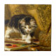 Ceramic Tile featuring Henriëtte Ronner-Knip’s oil painting The Young Artist (1821-1909). A black and white kitten plays with a paint set and two brushes. An adorable gift for cat lovers and Romanticism enthusiasts.
