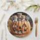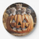 A group of kittens is adorably nestled inside a large carved pumpkin set against a rustic barn backdrop.