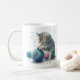 This mug features a cartoon drawing of a kitten/ cat playing with a ball of yarn in watercolor.