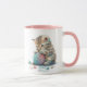 This mug features a cartoon drawing of a kitten/ cat playing with a ball of yarn in watercolor.