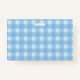 This name or identification badge is blue and white plaid with three cute kittens wearing pink bows sitting with their smiling white mother cat. Customise your name and information with the templates.