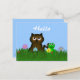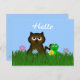 Cute Kitty and Frog, sitting in a field of grass and flowers, with Butterflies, and blue skies. Hello Postcard