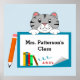 Customise this personalised classroom poster of a cat holding white banner with teacher's name and pencil and books in foreground. Will brighten up any elementary school class. Background colour can be changed too.