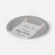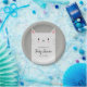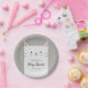 Cute paper plate design for your cat theme baby shower party. Illustration of a sweet white kitten with a smile on her face. There is text on her belly that says "Theresa's Baby Shower 02.02.20XX." Name, event title, and dates are easily editable online.