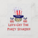 Cat with a red, white and blue top hat, fireworks, and patriotic-themed tulips says "Let's get the party started!"
