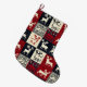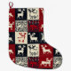This christmas stocking features a close-up knitted patchwork pattern with alternating squares in red, off-white, and dark blue. Each square showcases festive motifs such as stylised reindeer and abstract textured designs, creating a cosy winter look. With its rustic handmade aesthetic, this pattern is perfect for Christmas, Nordic-inspired décor, farmhouse style, or vintage holiday lovers. A charming design that blends tradition and warmth for the festive season.