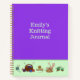 Purple knitting journal with custom title on front. With the optional graph paper choice, a knitter can create her own colorwork designs on each page. A good way to practice custom Fair Isle or stranded knitting. The graphs are not specifically knitting size, but a beginner may enjoy the practice. Or choose something else with lines, or sketchbook pages. Knitting needles and yarn with baskets make a border along the bottom. Notebooks come in three sizes.