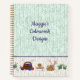 Knitting journal with custom title on front. With the optional graph paper choice, a knitter can create her own colorwork designs on each page. A good way to practice custom Fair Isle or stranded knitting. The graphs are not specifically knitting size, but a beginner may enjoy the practice. Or choose something else with lines, or sketchbook pages. Knitting needles and yarn with baskets make a border along the bottom. The entire background is knit stitches. Handwritten script is purple. Notebooks come in three sizes.