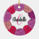 Personalised gift Christmas decoration with wool ball design in pink, purple and white.