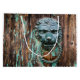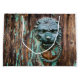 This close-up image shows a fascinating door knocker depicting a lion's head, with wood grain, dark streaks, knots, and splinters of turquoise paint in the background, all of which contribute beautifully to its rustic charm and natural appeal. This timeless design is reminiscent of old-world craftsmanship and adds a touch of warmth and character to any decor. The faded paint on the wood enhances this effect by creating a textured, layered look that evokes the history and stories contained within its fibres. Such a design introduces a sense of nature and tranquillity. With its earthy tones and authentic feel, this kind of home and living accent transforms your space into a serene retreat, combining natural elements and aesthetics.