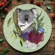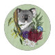 A cute Koala Bear sitting on a tree limb with flowers and eucalyptus leaves in a backdrop of green