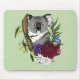A cute koala bear on a tree limb with flowers and eucalyptus leaves in backdrop of green